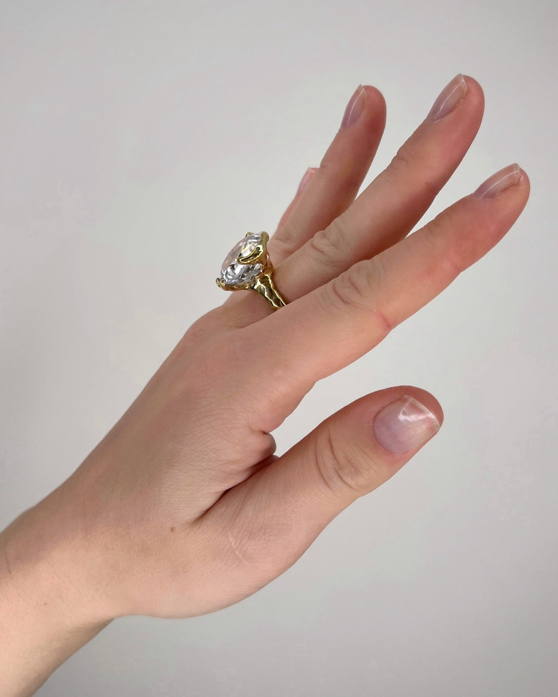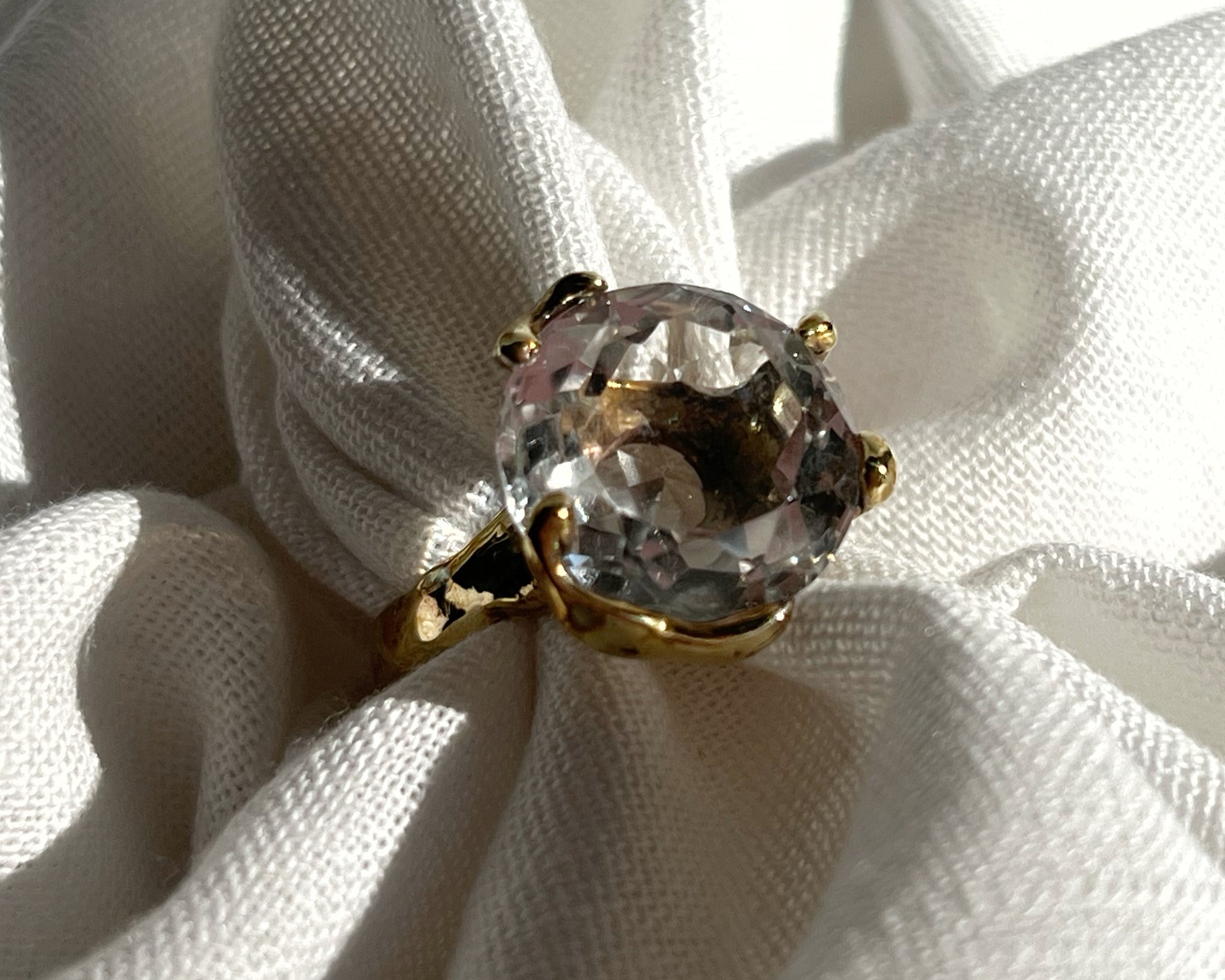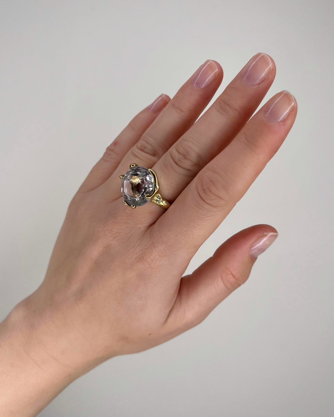 Ring comes in 9ct Yellow Gold with a big Clear Quartz gemstone. Note: The stones of the "Royal Vibes" collection are purposely imperfect – that’s what I love about them. It underlines their unique character. Small chips and scratches are part of their distinctive charm.