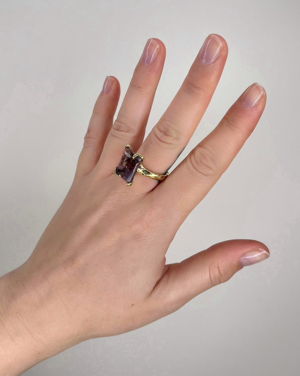 Ring comes in 9ct Yellow Gold with a big Ametrine (mix of Amethyst & Citrine) gemstone. Note: The stones of the "Royal Vibes" collection are purposely imperfect – that’s what I love about them. It underlines their unique character. Small chips and scratches are part of their distinctive charm.